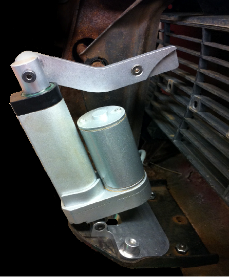 The fixed (lower) actuator bracket mounts to the original using the two original vacuum canister mounting holes and supplied ¼” allen bolts. Mount the rear bracket with the actuator fork facing the radiator as shown in the picture above and below.